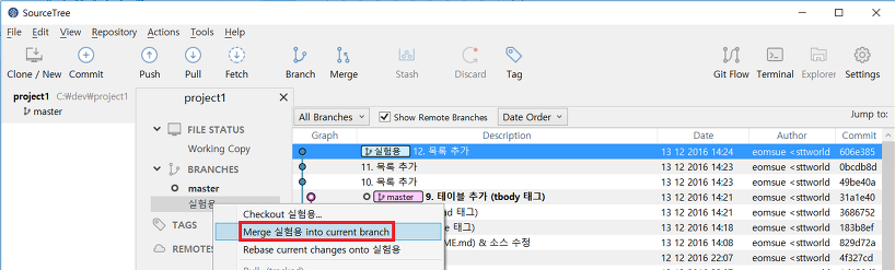신규기능 테스트가 끝났다고 가정했을 때, 실험용 브랜치를 master 브랜치로 합쳐보자. 실험용 브랜치를 우클릭한 뒤 'Merge 실험용 into current branch'를 클릭한다. 이를 'master브랜치로 체크아웃 했다'고 말할 수 있다. 브랜치가 잘 합쳐졌는지 확인해보고 싶다면, master브랜치의 소스에 실험용에서 만든 코드가 보이는지 찾아보면 된다.